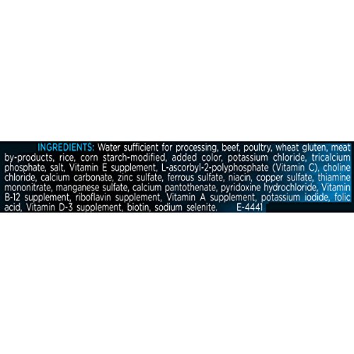 IngredientsWater Sufficient for Processing, Beef, Poultry, Wheat Gluten, Meat By-Products, Rice, Corn Starch-Modified, Added Color, Potassium Chloride, Tricalcium Phosphate, Salt, Vitamin E Supplement, L-Ascorbyl-2-Polyphosphate (Vitamin C), Choline Chloride, Calcium Carbonate, Zinc Sulfate, Ferrous Sulfate, Niacin, Copper Sulfate, Thiamine Mononitrate, Manganese Sulfate, Calcium Pantothenate, Pyridoxine Hydrochloride, Vitamin B-12 Supplement, Riboflavin Supplement, Vitamin A Supplement, Potassium Iodide, Folic Acid, Vitamin D-3 Supplement, Biotin, Sodium Selenite. E-4441.