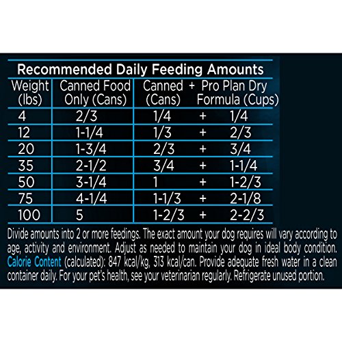 Divide amounts into 2 or more feedings. The exact amount your dog requires will vary according to age, activity and environment. Adjust as needed to maintain your dog in ideal body condition. Provide adequate fresh water in a clean container daily. For your pet(')s health, see your veterinarian regularly. Refrigerate unused portion.