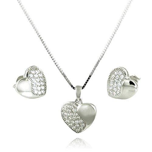 -. Feature : Genuine .925 sterling silver, plated with rhodium for added shine and durability / 18 inch fine rolo cable chain / SP.R.Ing ring clasps and tension backing on earrings / Hearts half covered in cubic zirconia / Great for women, girls, and as gifts