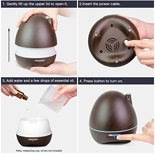 - WHAT YOU GET--- 1x high quality wood grain diffuser, 1x manual, 1X power adapter, 1x box, our worry-free 180 day warranty and friendly customer service.