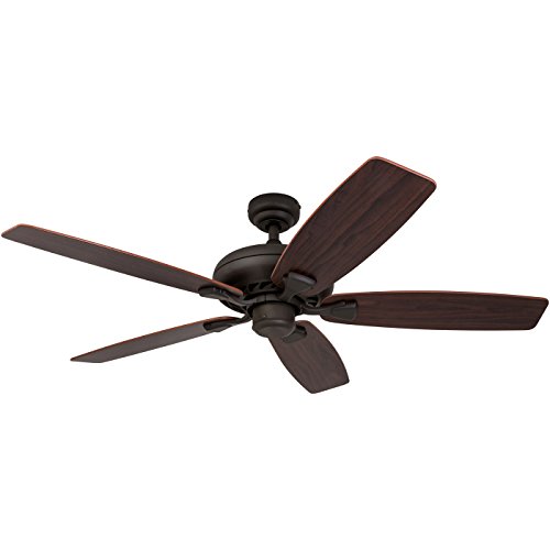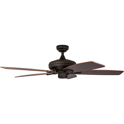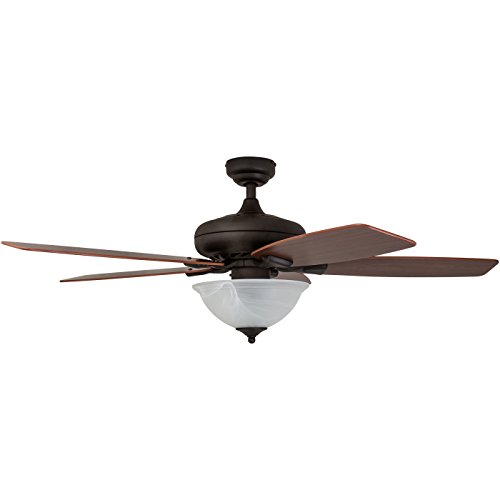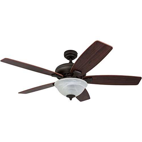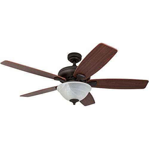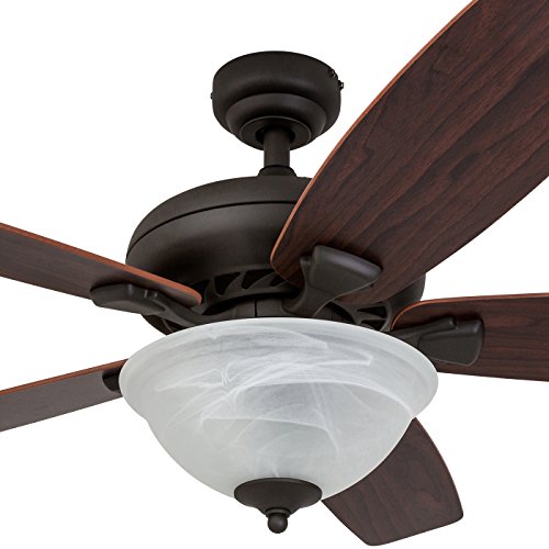 Features a Bronze finish with a beautiful alabaster glass bowl light conveniently quiet, four speed, reversible motor that can be run in reverse in the winter to aid in rotating warm air in the room reversible ceiling Fan blades. Uniquely designed with two separate blade finishes, Walnut on one side and Japanese hinoki on the other 52 inch blades, which are designed for medium to large sized rooms.