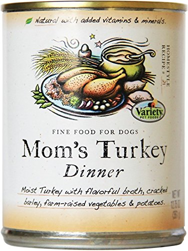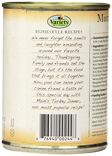 -. Binding : Misc. -. Brand : Variety -. EAN : 0876940002448 -. Feature : Natural with added vitamins and minerals / No artificial flavors or preservatives / No wheat, corn or dairy / Mom's Turkey Dinner is formulated to meet the nutritional levels established by the AAFCO Dog Food Nutrient Profiles for All Life Stages / Available in 12.75 oz. recyclable cans with Easy Open Tops -. Label : Variety -. Manufacturer : Variety -. Model : 00244 -. MPN : 00244 -. PackageQuantity : 1 -. PartNumber : 00244 -. ProductGroup : Pet Products -. ProductTypeName : PET_SUPPLIES -. Publisher : Variety -. Size : 12.75 -. Studio : Variety -. Title : Homestyle Recipes, Mom's Turkey Dinner with Turkey, 12/12.75-Ounce Cans, Natural Dog Food -. UPC : 876940002448