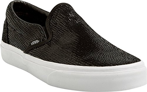 Features: The Pebble Snake capsule reveals a pebbled shimmer treatment over a snake-textured suede This Vans Classic Slip-on has a low profile, leather upper with all-over embossed snake print. Elastic side accents for easy on and off slip-on Vans signature waffle outsole Vans woven tab logo on side 0