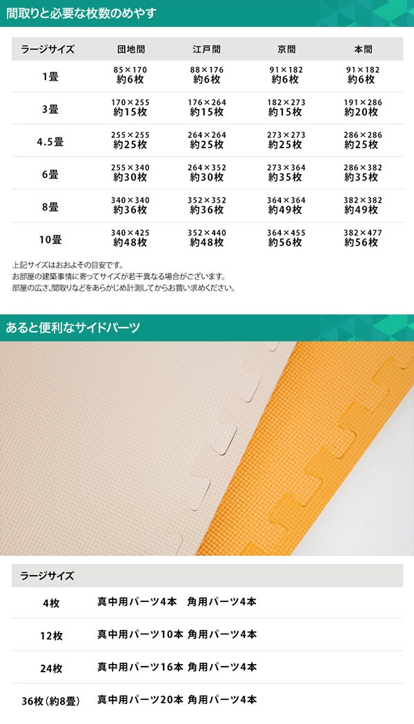 別売のサイドパーツを使うことで、ジョイント部分のギザギザがカバーされスッキリ敷くことができます。本体と合わせてサイドパーツを購入されることをおすすめします。(同サイズ、同色のものをご利用ください)