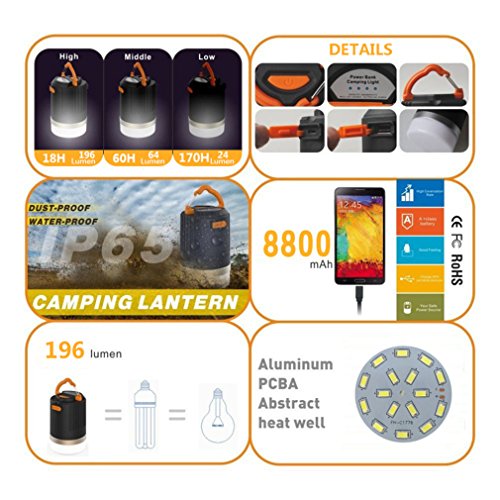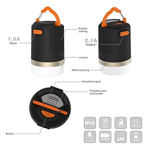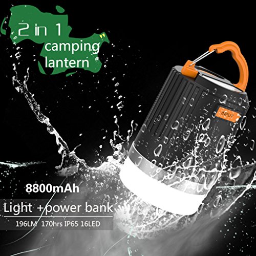 COMBO CAMPING LAMP : A broght camping latern with built-in 8800mAh (2.1A output) external battery pack power bank which can charge your cell phone when going hiking, camping, fishing or other outdoor sports.
