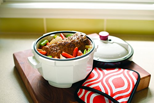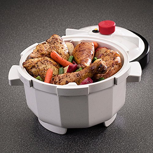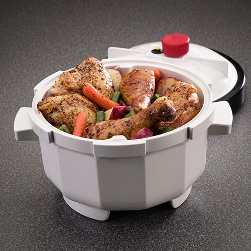 Product Description The most asked for microwave accessory. Works as a pressure cooker and holds 3 pounds of meat, 2.5 quarts of liquid. Tenderizes, cooks and flavors meat, poultry and vegetables in 30 minutes or less. Requires 8.5 inch clearance in your microwave oven. 9.5 x 9.5 x 8.25 inches. Proudly made in the USA by Nordic Ware.
