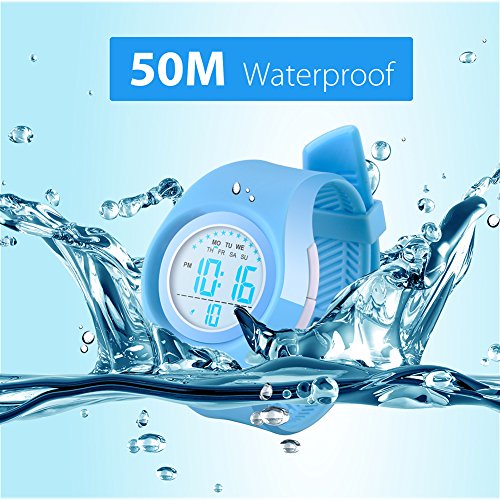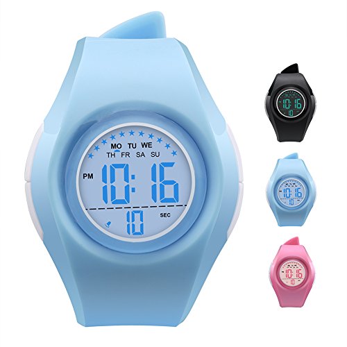 -. Feature : ★Multi-functional Kid Watch: Digits LCD Display, Display Hour, Minute, Second, Week, Stopwatch, Shock Resistant, Hourly Chime and Daily Alarm, 12H/24H format is changeable, Chronograph with split function, EL back light. Nice kid watch suitable for both boys and girls. / ★Long Battery Life with LED Backlight: Original Movement, provide precise and accurate time keeping. Imported battery which can provide the watch strong power. Kid watch use imported LED Colorful lights, just press the backlight button on the top left, you can clearly see the time at night. / ★Friendly Kid Watch with Shock Resistant : PC material case and Stainless Steel case back which enable the watch to be tough and durable. High quality silicone strap, plus spray handle oil, the strap is soft and comfortable and environmental friendly. Perfect children gift watch for boys and girls. / ★Waterproof Children Wrist Watch: 50 Meter Water resistant, feel free to wear our watch for cleaning, showering, swimming and diving at the beach.Kindly reminder: Please DO NOT press any buttons underwater.Too much water contact or usage in extreme Hot or Cold temperature will shorter watch life.