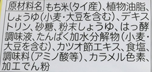 원재료:찹쌀,식물성 기름지,간장(밀 대두를 포함한다)고, 덱스트린,설탕,분말 간장,겨 효조미액,담백 가수분해물(밀 대두를 포함한다)고, 가다랭이절 엑기스,식염,조미료(아미노산등)고, 카라멜 색소
