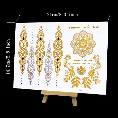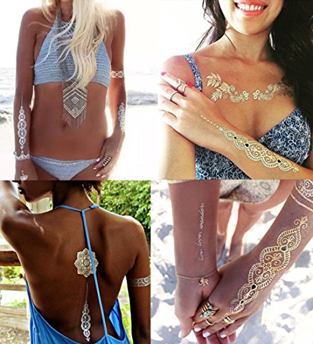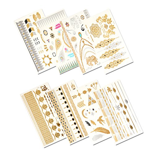 -. Feature : More than 150 distinctive and fashionable patterns: feathers, arrows, stars, diamonds, shells, wings, elephant, flowers etc. / High quality & waterproof: these metallic temporary tattoos will last for several days, keeps charming and flash look even after taking a shower or swimming without rubbing. / Well made of foil paper, these color temporary tattoos are safe and non toxic, will not hurt your sensitive skin. / Easy to apply and remove: Just wet with damp cloth, tattoos can be applied to the skin immediately, remove easily with baby oil or face cream / All purpose, can be wore on arm, face, leg, back, perfect for all occasions: birthday party, wedding, beaches, vacation and festivals.