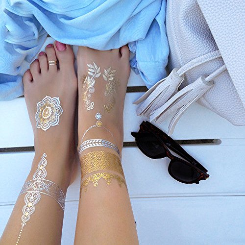 -. Title : Metallic Temporary Tattoos, PrettyDate 150+ Henna & Boho Designs in Gold Silver Black, Fake Glitter Jewelry Tattoos- Bracelets, Necklaces, Wrist, Anklets and Armbands(8 Sheets)