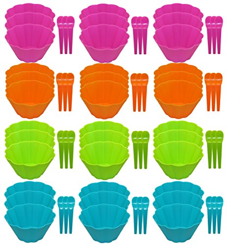 Set of 36 Ice Cream Bowl Sets! Matching Spoons - 72pc Set - Adorable Flower Wave Design - 4 Bright and Beautiful Colors - Perfect for Parties, Kid's, Picnics, Family Events or Just Regular Use! (36)