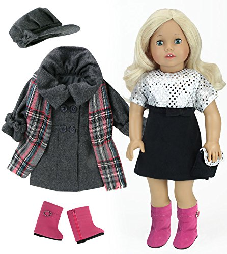 -. Feature : 18 Inch Doll Dress and Coat Set / 7 Pieces Include Hot Pink Zip Up Boots / Gray Wool Coat, Plaid Scarf & Wool Hat / Black Velvet & Silver Sequin Dress with Matching Purse and Silver Sequin Hair Piece / Made by Sophia's, Leading Doll Clothes Manufacturer, Not affiliated with American Girl®, Reg. Trademark of American Girl, LLC.