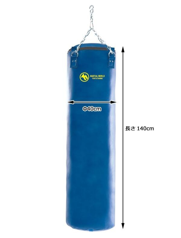 || 商品詳細説明 ||従来のレザートレーニングバッグから縫製を改良し耐久性がさらにアップ!!サンドバッグではめずらしいライトブルーのさわやかなカラーで、ジム内を明るく彩ります。創業以来、マーシャルワールドのトレーニングバッグは数多くの格闘技を志す方に愛用されています♪ 製造国:皮・チェーン:台湾、加工製造:日本 素材・材質:本体:合皮(内部強化シート張り)チェーン:SUS304ステンレス 商品サイズ:本体:長さ140×Φ40cm、チェーン長:68cm 重量:本体:約47kg、チェーン:約2kg 仕様:チェーン耐荷重:300kgチェーン:4本タイプ