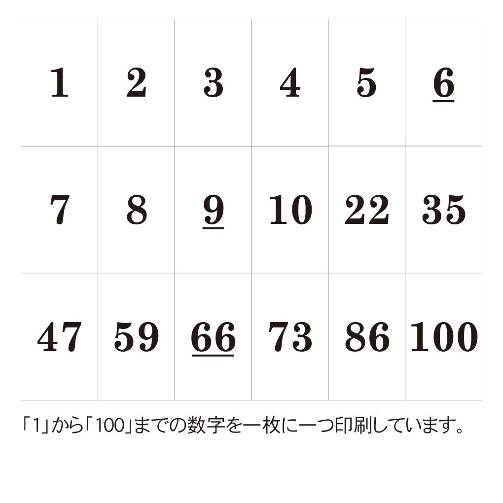 「1」から「100」までの数字を1枚のカードに一つずつ印刷しています。「6」と「9」のつく数字の一部にアンダーバーを入れています。