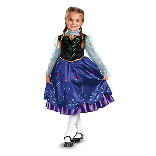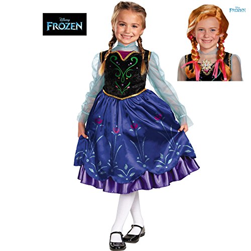 This Anna Deluxe Costume features a dress with petticoat, vest and character cameo!