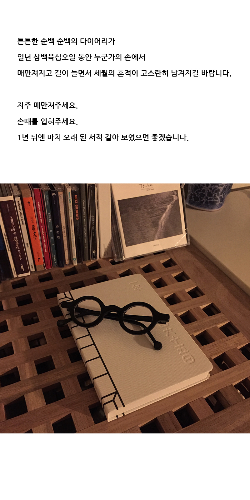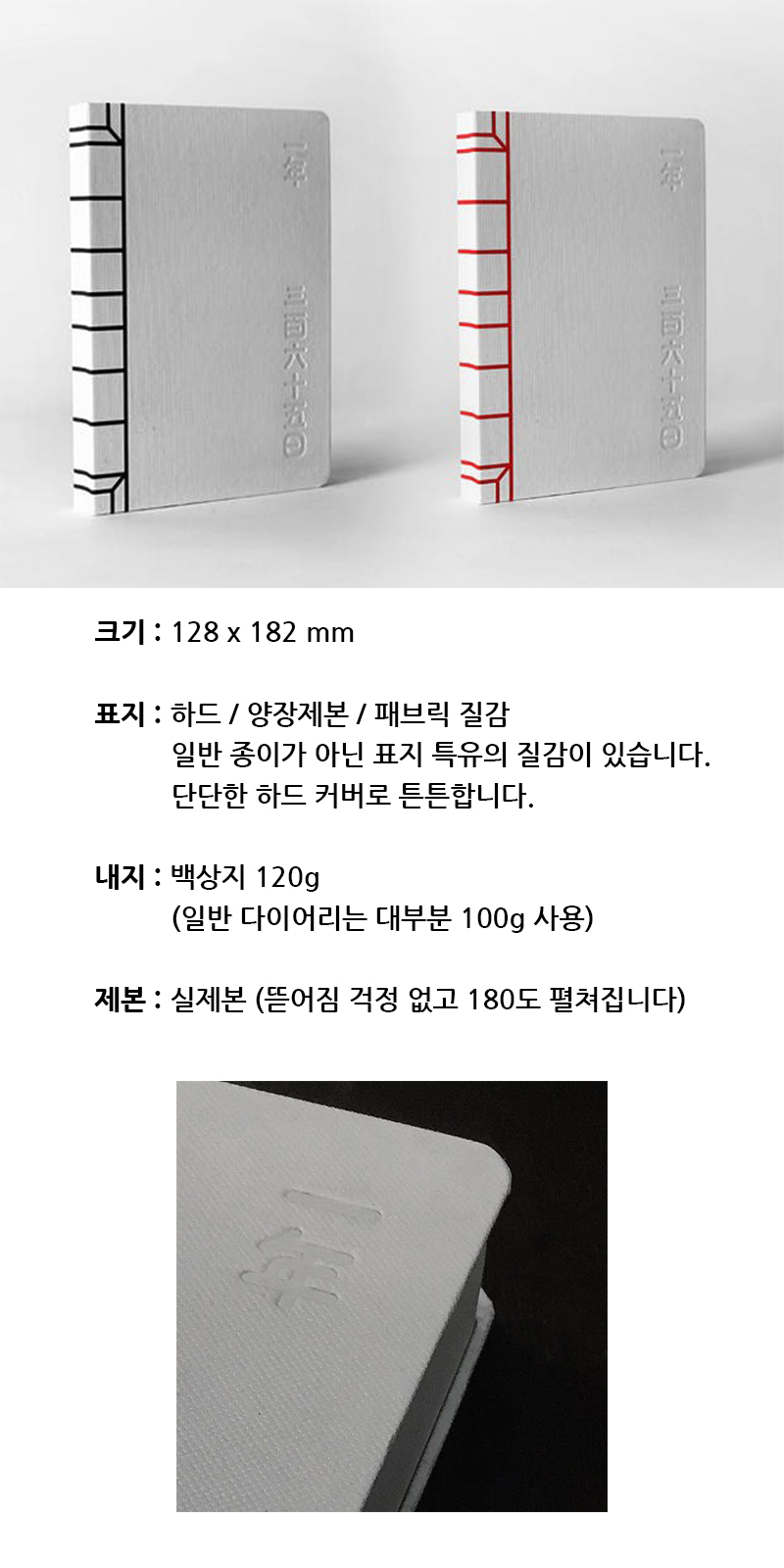 | 크기 : 128 x 182 mm 표지 : 하드 / 양장제본 / 패브릭 질감 일반 종이가 아닌 표지 특유의 질감이 있습니다. 단단한 하드 커버로 튼튼합니다. 내지 : 백상지 120g (일반 다이어리는 대부분 100g 사용) 제본 : 실제본 (뜯어짐 걱정 없고 180도 펼쳐집니다) 내지 구성 : 연간계획 / 12달 월간계획 / 64주 주간계획 / 줄지 32p / 모눈 20p / 무지 20p 책등과 연결된 라인은 오래된 서적의 제본 방식을 표현했습니다. 다이어리 표지로 잘 쓰이지 않는 화이트로 제작했습니다. 튼튼한 순백의 다이어리가 일년 삼백육십오일 동안 누군가의 손에서 매만져지고 길이 들면서 세월의 흔적이 고스란히 남겨지길 바랍니다. 자주 매만져주세요. 손때를 입혀주세요. 1년 뒤엔 마치 오래 된 서적 같아 보였으면 좋겠습니다. |