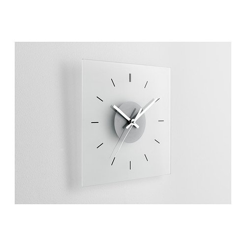 -. Binding : Kitchen -. Brand : SKOJ Wall clock, glass -. Color : White, Gray -. EAN : 5054186077610 -. Feature : Product dimensions : Depth: 1 ½ " x Height: 11 " x Width: 11 " / Battery required : AA size / The clock is extra resistant to impact as it is made of tempered glass. / Tempered/safety glass / Wipe clean with a damp cloth -. Label : Ikea -. Manufacturer : Ikea -. PackageQuantity : 1 -. ProductGroup : Home -. ProductTypeName : HOME -. Publisher : Ikea -. Studio : Ikea -. Title : Ikea Skoj Modern Wall Clock, Glass Analog Clock