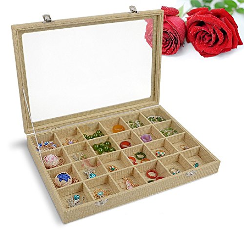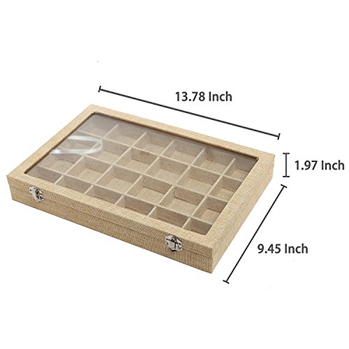 Constructed with sturdy composite board wrapped in premium linen fabric with removable compartment dividers and a glass lid to organize and protect your jewelries and accessories.