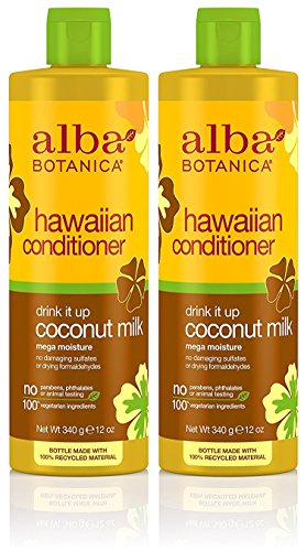 -. Feature : Pack of 2, each 12 oz of Alba Botanica, Drink It Up Coconut Milk Hawaiian Conditioner / High in fatty acids and protein, coconut milk locks in moisture to strengthen the cuticle and reduce split ends / Calendula and tropical oils protect from heat styling and makes sure dry hair is soft, nourished and parched no more / No damaging sulfates or drying formaldehydes / 100% vegetarian and no animal testing, No parabens, sulfates, phthalates, or artificial colors