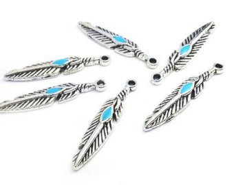 Native American Feather Charms, 50 pc Silver Tone Pendants 27mm x 6mm, Faux Turquoise (Enamel)