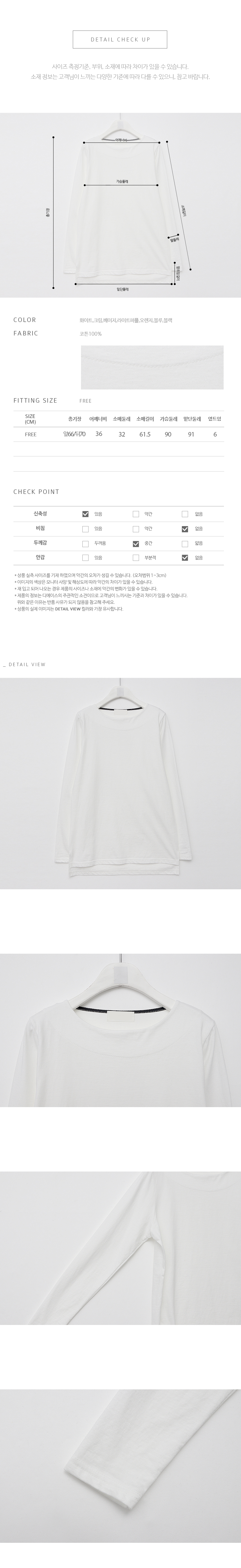 넓은 라운드넥에 안쪽에 넓게 제감의 라인을 덧대어줘 목선이 깔끔하고 단정한 기본 핏의 코튼 티셔츠랍니다 다양한 색감이 포인트 주기 좋은 아이템으로 코튼 100%의 쾌적한 소재감이 기분 좋은 데일리 티셔츠랍니다 색상은 화이트, 크림, 베이지, 라이트퍼플, 오렌지, 블루, 블랙 사이즈는 FREE44~66 ▼ 관련상품 : 컬러풀 하찌 가디건마인느 배색 숄 가디건블리 머메이드 원피스