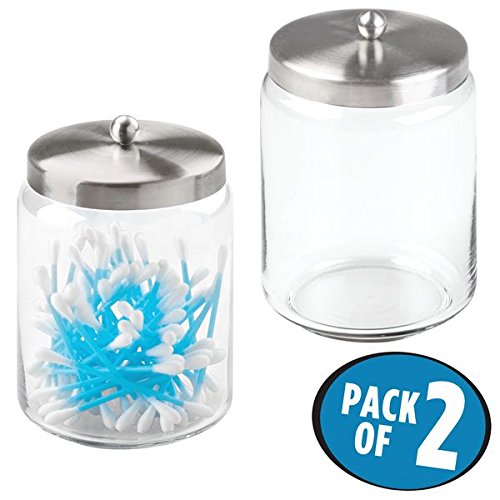mDesign Bathroom Vanity Glass Storage Organizer Canister Jars for Q tips, Cotton Swabs, Cotton Rounds, Cotton Balls, Makeup Sponges, Bath Salts - Pack of 2, Tall, Clear/Brushed Stainless Steel