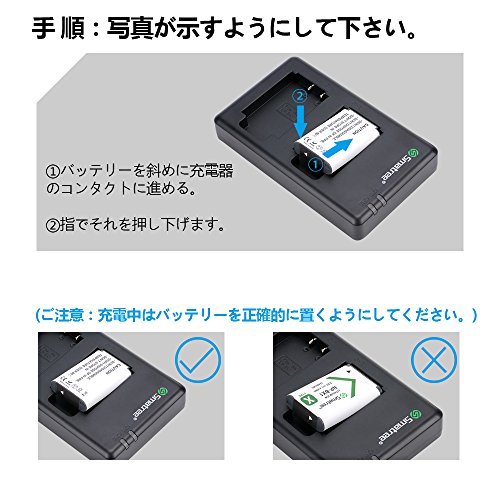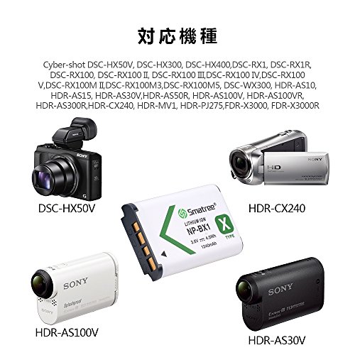 -. Feature : 対応機種:Sony Cyber-shot DSC-RX100, DSC-RX100 II, DSC-RX100M II, DSC-RX100 III, DSC-RX100 V, DSC-RX100 IV, DSC-RX100M3, DSC-HX50V, DSC-HX60V, DSC-HX90V, DSC-HX300, DSC-HX400V, DSC-RX1, DSC-RX1R, DSC-RX1RM2, DSC-WX300, DSC-WX350, FDR-X3000, FDR-X3000R, HDR-AS10, HDR-AS15, HDR-AS30V, HDR-AS100V, HDR-AS100VR, HDR-CX240, HDR-CX405, HDR-MV1, HDR-PJ410,HDR-PJ275,WX500など対応。 / 2つのバッテリーを同時に充電することができます。充電される時、LEDインジケータは赤ランプで、充電完了後は緑ランプになります。1年保障期間があり、ご安心してください。 / 便利な充電方式:USBで給電する設計により、モバイルバッテリーからも、コンセントから、ソラーチャージャーからもお手軽くバッテリーパックを充電可能で、旅行やハイキングに最適 / パッケージ内容:互換バッテリー1240mAh*2, 急速デュアル充電器*1, マイクロ USB ケーブル*1,仕様書*1、smatree布*1