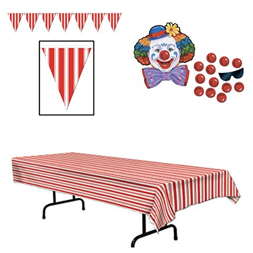 CIRCUS Carnival Themed PARTY DECORATIONS - Tablecloth PENNANTS Banner & PIN Nose on CLOWN Game - DECOR
