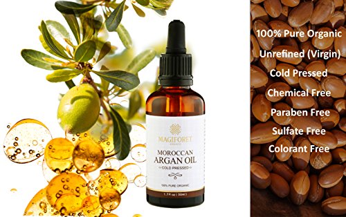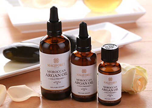 Pure Argan Oil has been used for centuries by the Berber tribe of Morocco as an all-natural treatment for the skin, hair and body. This rare oil has only recently been re-discovered as an ingredient in cosmetic products. MagiForet 100% Pure and Organic Argan Oil is cold pressed and unrefined with no chemicals added. It is a whole new way to reveal softer, smoother, healthier-looking skin and hair.Benefits: