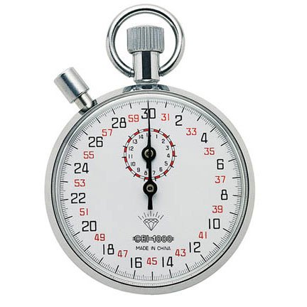 Product Description Mechanical stopwatch, 1/10 sec, 15 min. register, 30 sec. sweep. Thirteen jewels, and shock resistant metal case. Two buttons, 1 for start/stop, 2nd for reset. Red/Black numerals.