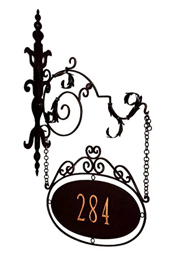 -. Brand : Intelligent Design -. Color : Gold -. EAN : 0634894685175 -. Feature : Handcrafted of iron and tole. Use indoors or outdoors. / You choose number in the center of the plaque (up to 5 digits). The same number will appear on both sides. Numbers are 4'' high and finished in Italian gold. CUSTOMIZE WITH YOUR NUMBER! 1-5 DIGITS / Hand finished in dark brown with gold highlights. Bracket has holes for easy mounting with screws (not included). / Size: 26'' L X 30'' H X 6'' Deep - Weight: 7.4 LBS / Condition: Brand New - First Quality • Heirloom Quality - Expertly hand crafted and hand finished • Due to the hand crafted nature of this piece, each piece may have subtle differences. -. ProductGroup : Lawn & Patio -. ProductTypeName : OUTDOOR_LIVING -. Title : Personalized Iron Address Sign | House Number Wall Bracket Outdoor 5 Digit -. UPC : 634894685175