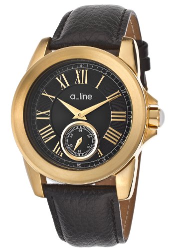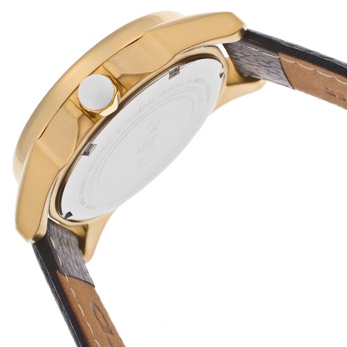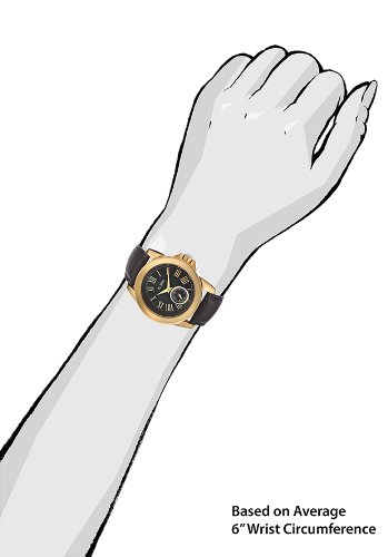 Mineral crystal; gold tone ion-plated stainless steel case; black leather strap