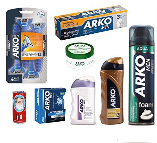 - 8 piece set which includes, arko men system 3 razor, arko shaving foam, arko shaving cream, arko after shave balm, arko after shave cologne, arko after shave lotion and arko hand/face/body cream