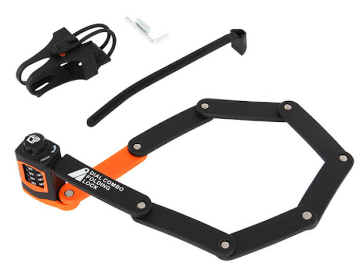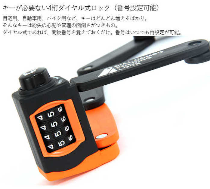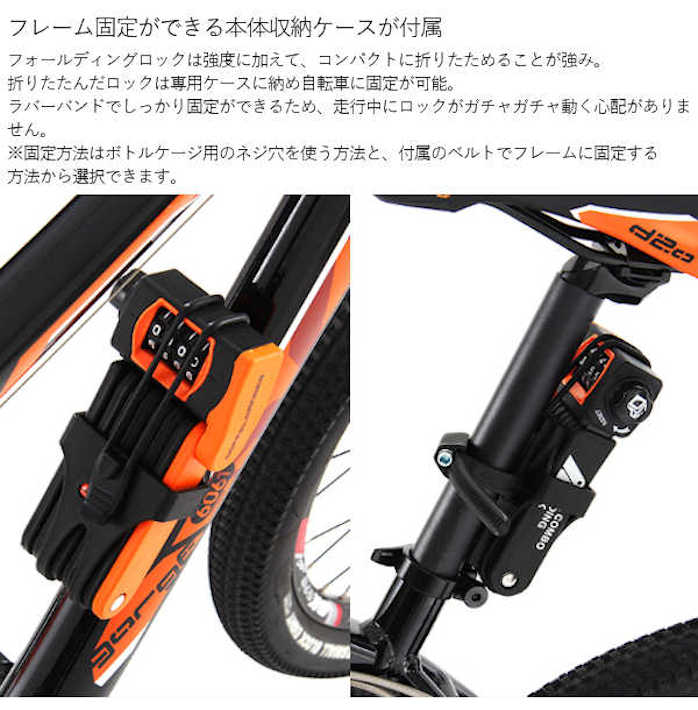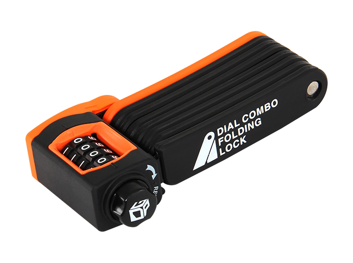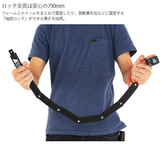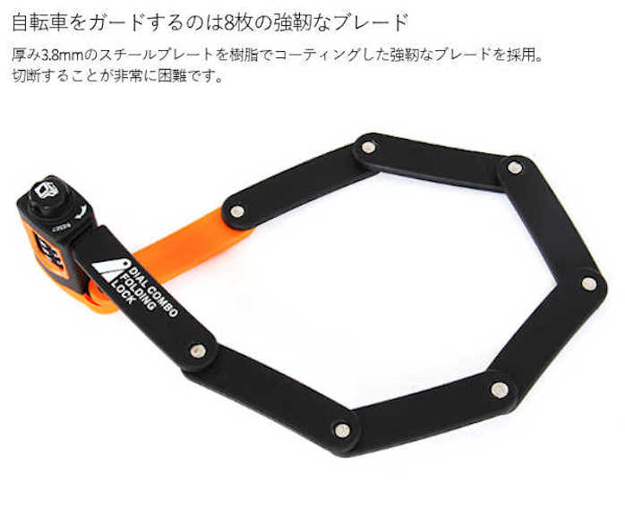 .8mmのスチールプレートを樹脂でコーティングしたタフなブレードが鎖状につらなった強靭なフォールディングロック。折りたたみ式だから自転車乗車時には折りたたんで専用ケース(フレーム固定)に収納でき、持ち運びも簡単。 施錠はキーレスで行える4桁ダイヤル式。まさにタフに守って、楽に運び、手間を掛けない頼れるロック。
