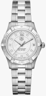 -. Binding : Watch -. Brand : TAG Heuer -. Color : Steel -. Department : Womens -. EAN : 0033586498626 -. Feature : Two-tone watch with mother-of pearl dial and diamond hour markers / Swiss quartz movement with analog display / Protective scratch-resistant sapphire crystal dial window / Features date window, three-link bracelet, logoed dial, unidirectional bezel, and gold-over clasp with double push-button safety / Water resistant to 990 feet (300 M):suitable for scuba diving to a depth of 30 meters for up to 2 hours -. Label : TAG Heuer -. Manufacturer : TAG Heuer -. Model : WAF1312.BA0817 -. MPN : WAF1312.BA0817 -. PackageQuantity : 1 -. PartNumber : WAF1312.BA0817 -. ProductGroup : Watch -. ProductTypeName : WATCH -. Publisher : TAG Heuer -. ReleaseDate : 2014-09-30 -. Studio : TAG Heuer -. Title : TAG Heuer Women's WAF1312.BA0817 "Aquaracer" Stainless Steel and Diamond Watch -. UPC : 760643108180