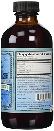 -. Binding : Health and Beauty -. Brand : Green Pasture -. Department : dietary supplements -. EAN : 0705105298207 -. Feature : Green Pasture Products Liquid Cod Liver OIL in Arctic MINT / 8oz Bottle Provides 118 Servings -. IsAdultProduct : 0 -. Label : Green Pasture -. LegalDisclaimer : Actual product packaging and materials may contain more and different information than what is shown on our website. We recommend that you do not rely solely on the information presented and that you always read labels, warnings, and directions before using or consuming a product. Please see our full disclaimer below. -. Manufacturer : Green Pasture -. Model : FCLOAM237 -. MPN : FCLOAM237 -. PackageQuantity : 1 -. PartNumber : FCLOAM237 -. ProductGroup : Health and Beauty -. ProductTypeName : HEALTH_PERSONAL_CARE -. Publisher : Green Pasture -. Size : 8 fl. oz. 237 ml 118 servings -. Studio : Green Pasture -. Title : Green Pasture Blue Ice Fermented Cod Liver Oil Liquid, Arctic Mint, 8 fl oz -. UPC : 705105298207