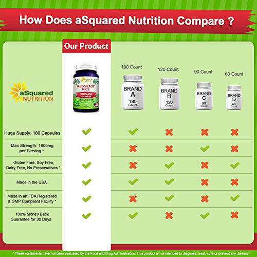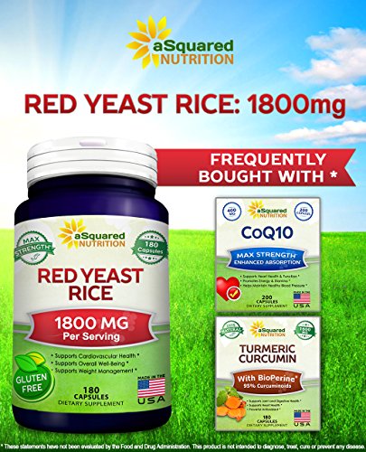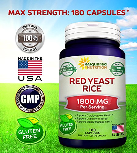 -. Feature : MAX STRENGTH FORMULA: aSquared Nutrition's maximum strength Red Yeast Rice supplement contains 1800mg of pure Red Yeast Rice per serving. With 180 capsules in every bottle, you receive a full 90 day supply. Red Yeast Rice is made from fermented yeast that grows on rice called Monascus Purpureus. Don't settle for Red Yeast Rice (RYR) products that only offer 500mg, 600mg, 900mg or 1200mg of Red Yeast Rice per serving, or that only offer 60, 90 or 120 capsules, soft gels, tablets or pills. * / AMAZING HEALTH BENEFITS: Red Yeast Rice (RYR) supplementation supports cardiovascular health, supports healthy weight management, promotes digestive & liver health, and may support healthy blood circulation. The Monascus Purpureus yeast produces numerous metabolites including pigments, monacolins, and GABA. Red Yeast Rice also often contains sterols such as beta-sitosterol and unsaturated fatty acids such as Linolenic Acid. * / BACKGROUND: Red Yeast Rice (RYR) has been used in traditional Chinese medicine and other Asian cultures for medicinal purposes. It has also been used in the production of several types of Japanese sake and Korean rice wine. Red Yeast Rice is made from yeast that grows on rice called Monascus Purpureus, which is thought to contain a number of monacolins. Red Yeast Rice acquires its red & purple color when it is cultivated with Monascus Purpureus mold. * / BEST VALUE ON AMAZON: Our Red Yeast Rice product is backed by our 100% Money Back Guarantee for 30 Days. Each bottle contains 180 capsules, and each serving contains 1800 MG of pure RYR (2 capsules per serving, 900mg per capsule). Our complex is Gluten Free, Soy Free, Dairy Free, and has No Preservatives. It is made in the USA, in an FDA registered and GMP compliant facility. Try also our All Natural Turmeric Curcumin, Magnesium Glycinate, CoQ10 400mg or 200mg (Coenzyme Q10), and D3 & K 2. * / MANY NAMES AND FORMS: Red Yeast Rice has many names such as red rice koji, red mold, akakoji, red fermented rice, red kojic rice, anka, and ang-kak. Red Yeast Rice comes in many forms including capsules, pills, tablets, soft gels, powder & liquid. Try also our All Natural Ceylon Cinnamon, CoQ10 400mg or 200mg (Coenzyme Q10), Methyl B12, Vitamin D3 with K 2, Turmeric Curcumin, Milk Thistle 1000mg, & Black Cumin Seed Oil 500mg. *