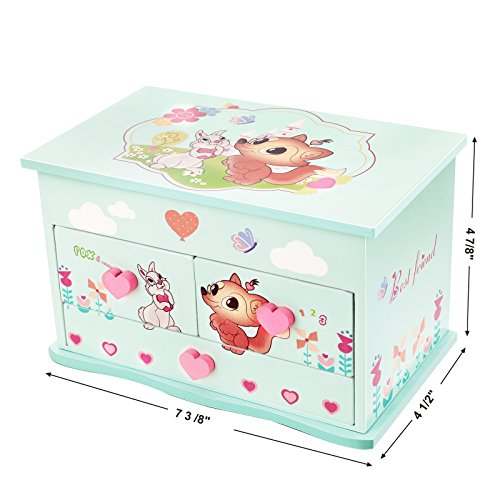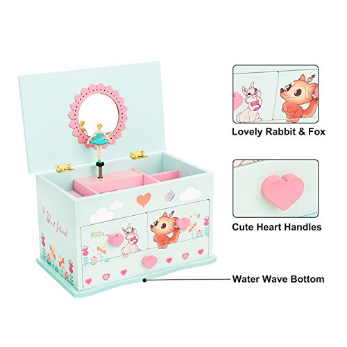 -. Feature : BALLERINA MUSIC BOX: Lovely ballerina figurine twirling to the melodious melody of "Twinkle Twinkle Little Star", easily motivates your girls to dance follow the ballerina / LOVELY FOX & RABBIT PATTERN: Adorable cartoon animals and scenery brings a sweet and romantic world to kids; cute pink heart-shape handles and eye-catching water-wave bottom line; great decor for kids room / AMPLE STORAGE SPACE: 3 drawers and 8 compartments make girls' little jewelry like necklaces, bracelets, cufflinks, hairpins separately; come with a handkerchief for easy cleaning / STURDY WOODEN BOX & FLOWER MIRROR: Made of high quality MDF material, the music jewelry box is sturdy enough to accompany the growth of your little girls; the delicate mirror hemming with a flower is beautiful, girls will love it / PERFECT GIFT IDEA: Overall Size 7 3 /8"L x 4 1/2"W x 4 7/8"H, ideal Christmas gift for girls of 3-13 years old and perfect for any gift-giving occasion
