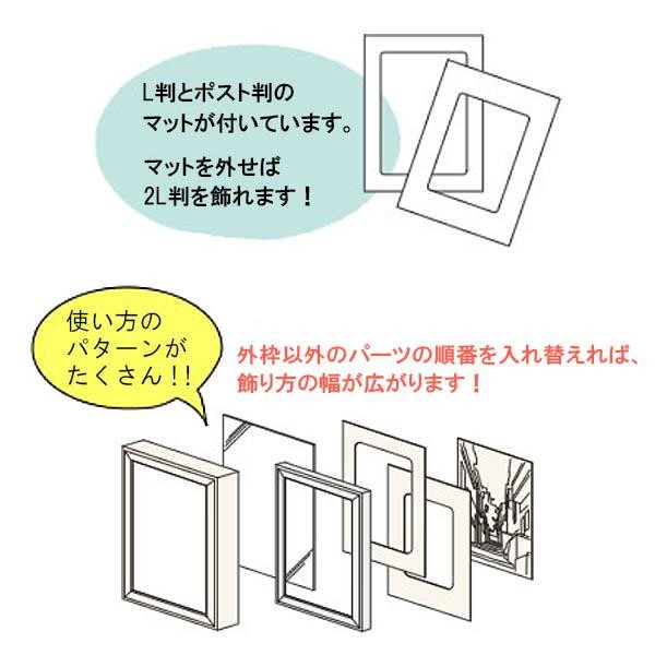 | L判・ポスト判のマットが付いており、マットを外せば2L判もお使いいただけます。3サイズで使えて各パーツの入れ替えも可能なので、飾り方の幅も広がる♪奥行が15mmあるので、写真と一緒に小物も飾れます。 |