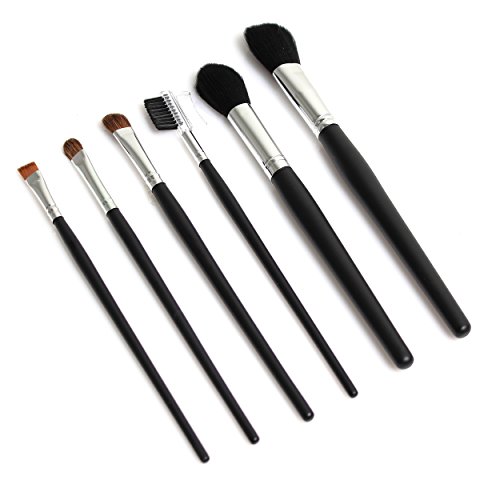 - 6 piece makeup brush set includes: 2 large, full coverage cheek/face brushes, 2 eye blending/smudge brushes, 1 angled liner, 1 eyebrow groomer brush