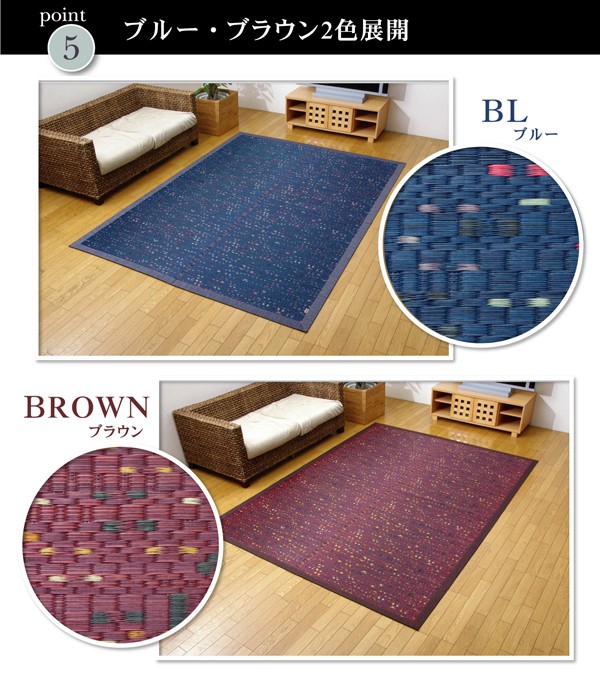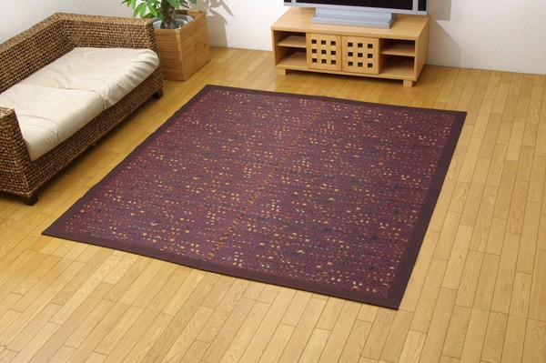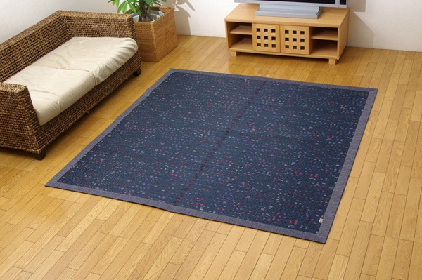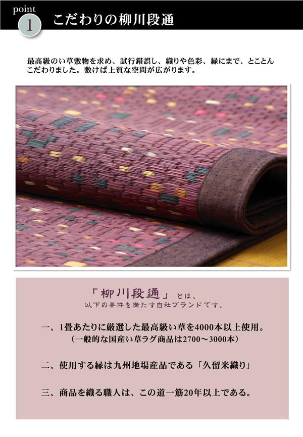 『柳川段通』シリーズのイ草カーペットです。柳川段通の特長として(1)厳選したイ草を通常の商品よりも約1.4倍(メーカー比)使用しています。(2)ヘリ生地は久留米織りの生地を使用しています。久留米織りとは福岡県久留米地方の伝統的な織りもので、着物や洋服によく使われている貴重な織りものです。(3)本商品の織り職人はこの道一筋20年~40年の熟練の匠です。国産(九州産)のい草を使用しています。一本一本が太く、表皮が厚く繊維がキメ細かいので弾力性があり、耐久性に優れています。い草には空気の自然浄化作用、湿度の調節作用などがあります。また汚れにくく、使用するうちに黄金色に変化し味が出ます。い草に青森ヒバ加工を施しています。(抗菌、防臭効果)
