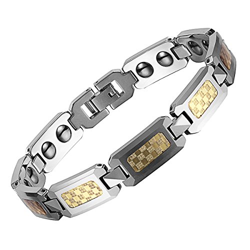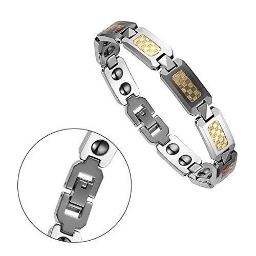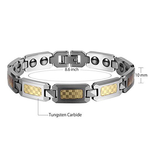 Material: The bracelet is crafted of heavyweight tungsten Carbide. Doesn't react with oxygen, meaning there is no worry about tarnishing. No more allergic reactions from stainless steel and copper bracelets
