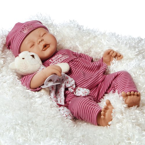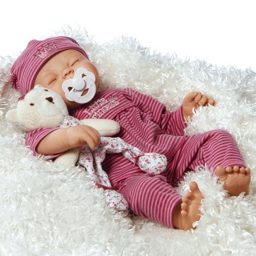 Sleeping peacefully, this adorable baby doll has realistic features like those of reborn babies. A royal sweetheart indeed, she is dressed in a three piece striped jersey knit "jammie" set. Her little hat is accented with a tiny princess crown appliqué that coordinates with her embroidered bodice that says, "Little Princess". Add the teddy bear "plushie" and you've got a perfect combination for a tiny sleeping princess. "Little Princess" is truly a delight for your eyes and ears. She will surely be a perfect addition to your collection of newborn baby dolls. She is so adorable from her cute sleeping face down to her tiny little toes. Playing with her is just so much fun with her pacifier that fits perfectly into her mouth. What are you waiting for? Bring her home today and cherish her forever! "Little Princess" is lovingly handcrafted from our trademarked GentleTouch Vinyl, measures 17 inches from head to toe and comes with a weighted cloth body, all accessories shown, a numbered Certificate of Authenticity and a collector's box.
