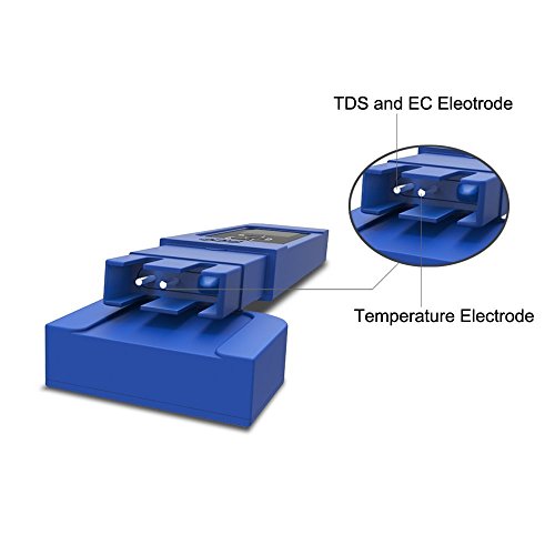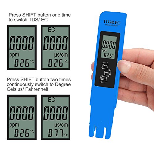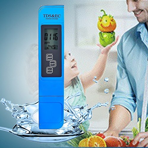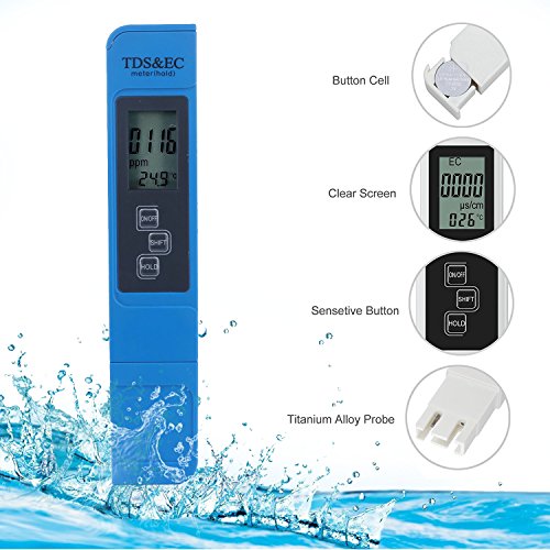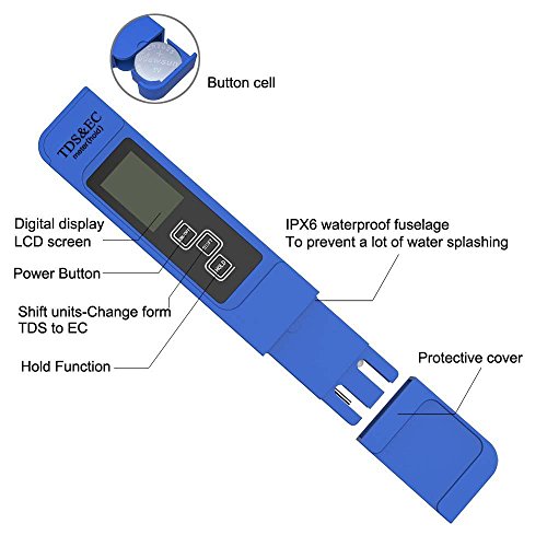 -. Feature : ★Professional Water Quality Meter:: This advanced ppm reader combines TDS (Total Dissolved Solids), EC (Electrical Conductivity) and a Temperature meter all in one ergonomically designed pen mention a detailed report on everything you need to know. , Or any colloidal silver. You can SAVE the measurements for future reference. / ★Lock Function: easy to read and record, the instrument will lock the reading, 5 minutes automatically turn off the function, the battery will not bubble / ★TDS Pen Three-In-One Measuring range: Conductivity: 0-9990us / cm, TDS: 0-9999ppm, degrees Celsius: 0.1-80.0 ℃, Fahrenheit: 32.0-176.0 ℉, accuracy: ± 2% / ★Can Be Used In: Water purifiers and filters, food (vegetable, fruit) & drink quality monitoring, pools and spas, aquarium, hydroponics / ★A Must Have Tool For Every Houshold: instantly check on the overall quality of the water you and your family drink. Know if your tap water purification system, such as reverse osmosis (RO) works properly or needs replacement, protecting your and your family's health Know when is the time to change filters, maintenance the aquarium, add or remove contaminants from your water!