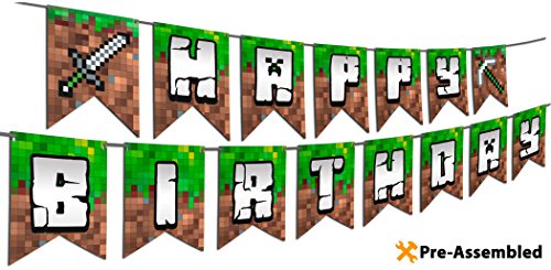 -. Title : Pixel Style Happy Birthday Banner - Pre-Assembled, 2-Side P.R.Inted HD Color Pixelated Mining Design. 2 Formats. Extra thick Paper Pennant Flags with Super Long Ribbon. Party Supply for Gamer Boys