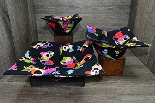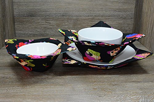 Product Description Microwave cozy set includes 1 small bowl cozy (Approx 6.5" sq), 1 medium bowl cozy (Approx 8" sq), 1 dinner plate cozy (Approx 10" sq.) The dinner plate cozy can also be used for round casserole dishes and the small size is great for coffee mugs! These microwave cozies are the perfect solution to handling super-hot dishes. Cooking and reheating food in a dish cozy makes life so much easier! Place your microwaveable dish inside the bowl cozy and put the whole thing in the microwave to heat. To take the bowl out, you simply grab the corners of the cozy. We found that our kids can now get their dishes out of the microwave safely. Cozies will also protect your fingers from the cold when holding a bowl of ice cream and are great for protecting your table. You can also use a cozy placed on top the dish you are microwaving to help steam food. MATERIALS: * 100% cotton fabric * 2 layers of 100% cotton batting * 100% cotton thread Please be advised: Bowl cozies must only be used in microwaves with a rotating base. To avoid scorching or burning, please make sure cozy freely rotates in your microwave. Never leave microwave unattended. Make sure cozy is clean with no pieces of food attached. Do not microwave cozy for more than three minutes. Cozies can be machine washed on delicate cycle. Reshape and allow to air dry for best results. Please let us know if this is a gift, and we will ship without a packing slip enclosed! #bowlcozy #microwaveable #handmadeatamazon #hot4handmade #buyhandmade 0