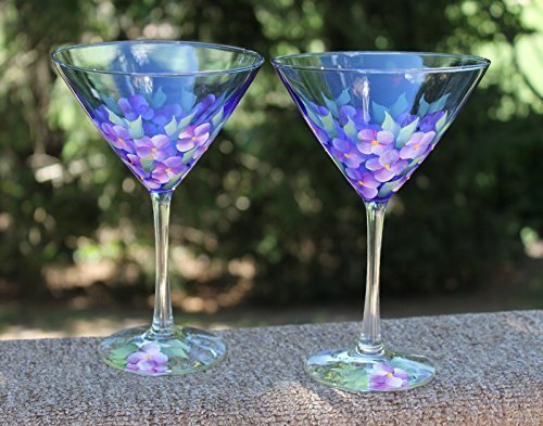 Product Description Elegant set of two Hand Painted Martini Glasses with Violets on a Cobalt blue glass. Perfect as an Anniversary gift, Birthday gift, Valentines gift, Wedding gift, Gift for her or just because... The violet, the traditional Valentine's Day flower, changes meaning depending on the color of the flower. Blue violet flowers symbolizes love and faithfulness, white violets represent purity and chastity, and yellow violets symbolize high worth and goodness. According to legend, the Christian priest St. Valentine wrote love notes using ink made from the violets he grew. In more recent years, however, these beauties have been upstaged by the more romantic rose. 0