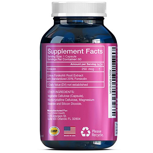 -. Binding : Health and Beauty -. Brand : Northfield Health -. Color : Metallic -. EAN : 0806810458471 -. Feature : NATURAL FAT BURN - Weight loss effect of Coleus Forskohlii torches calories + adipose tissue stores - blast stomach fat + reduce waistline + tone abs + stop fatty weight gain - pro lean tissue gains / ANTIOXIDANT ROOT - Used traditionally in Ayurveda as a medicinal super food - now speeds fat loss by activating enzymes and increasing metabolism - boosts cellular adenosine monophosphate - cAMP / NATURAL INGREDIENTS - Keep burning all day when you rev your metabolism the wholesome way - each pill is 100% vegetarian + vegan - with 20% standardized potent powder stacked in natural veggie caps / HEART BONUS - Verified research on how Forskolin works - widens blood vessels - lowers blood pressure - supports healthy circulation + increases enzymatic fat burning in cells / REVIEWS + BENEFITS - Forskolin is used by people for respiratory + skin + eye + metabolic + digestive + heart health - not just a belly buster that helps you lose weight -. IsAdultProduct : 0 -. Label : Northfield Health -. Manufacturer : Northfield Health -. MPN : LE -. PackageQuantity : 1 -. PartNumber : LE -. ProductGroup : Health and Beauty -. ProductTypeName : HEALTH_PERSONAL_CARE -. Publisher : Northfield Health -. Studio : Northfield Health -. Title : Premium Forskolin Capsules for Weight Loss - 250 mg Pure Fat Burner Supplement - Slimming Extract Appetite Suppressant - Natural Antioxidant - Metabolism Boost for Men + Women - Northfield Health -. UPC : 806810458471