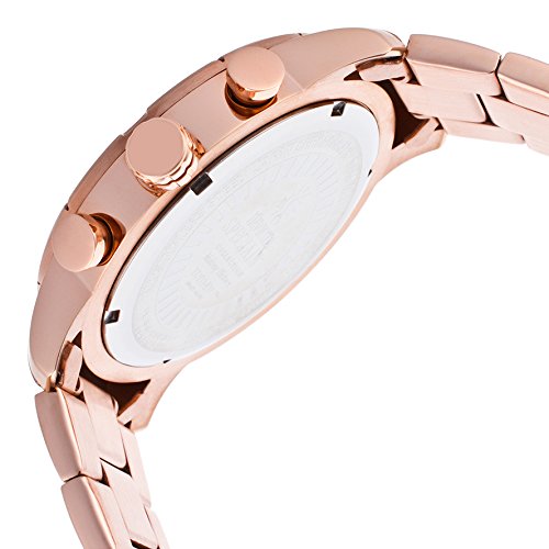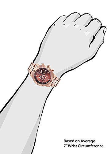 - Feature : Chronograph functions with 60 second, 60 minute and 1/10 of a second sub dials; date window at 3:00 / Brown dial with rose gold tone and white hands and hour markers, rose gold tone Arabic numerals; luminous; flame fusion crystal; 18k rose gold ion-plated stainless steel case and bracelet / Japanese-quartz movement / Case diameter: 45mm / Water resistant to 330 feet