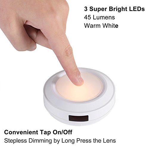- 45 LUMENS: Built in 3 super bright SMD LEDs, warm white 3000K, frosted lens enable the lighting nice diffused and glare-free; battery operated and convenient tap on/off